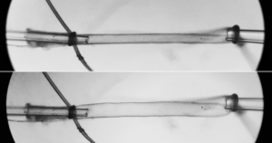 In this picture, you can see a vessel after I have placed it on the glass tubes and tied string around it to keep it in place. The top picture shows the vessel before I have blown it up. The bottom picture shows the exact same vessel after I blow it up. You can see that it inflates.