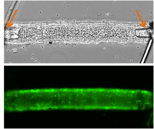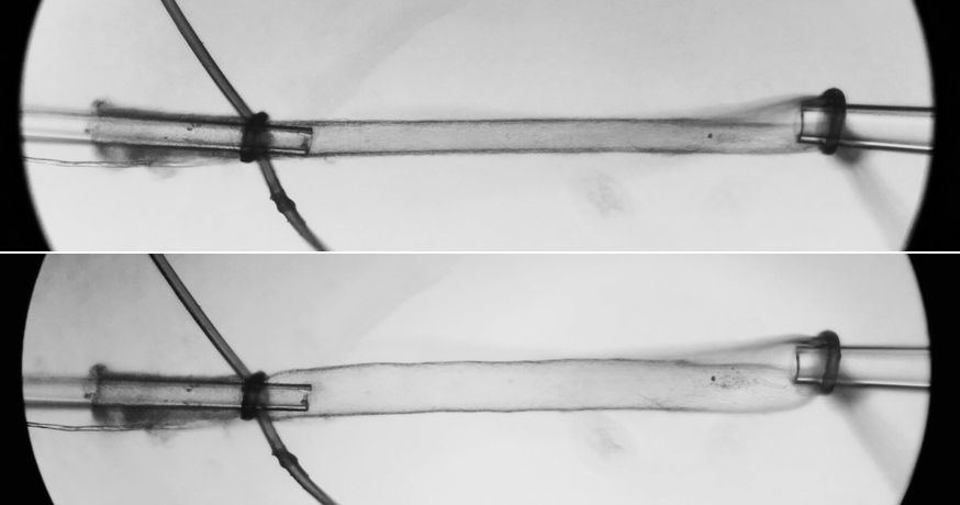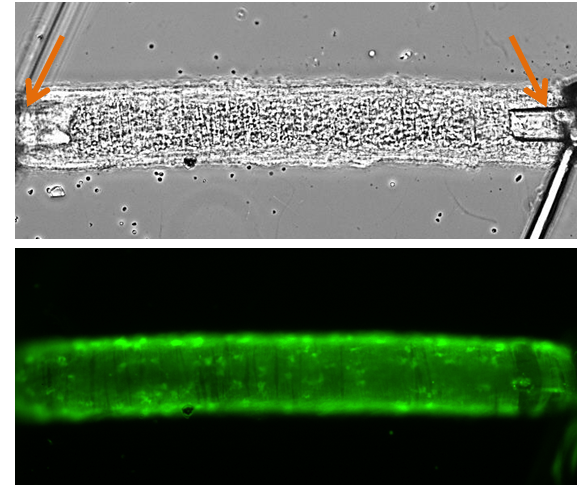 The top picture here shows another blood vessel which I have placed on the small glass tubes. The end of the glass tubes can be seen inside the blood vessel (orange arrows). The bottom picture shows the same vessel after I have left it in a special chemical. The cells in the vessel soak up the chemical. Inside the cells, when the chemical touches a certain molecule that I am interested in, a chemical reaction happens and that cell will start to glow. I use a microscope and a green laser to measure how much the vessel is glowing.