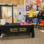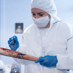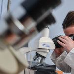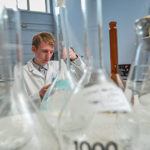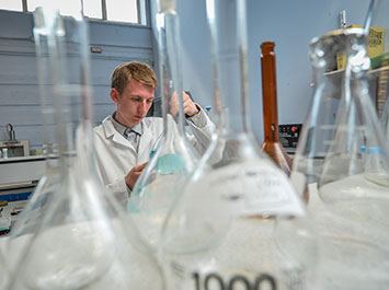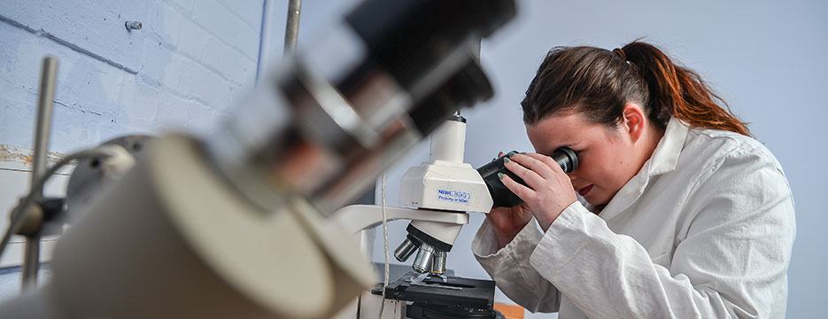 Covid-19 Volunteer 2020 – PresentStudent in personal protective clothing takes a swab of red coloured stain on the end of a baseball bat