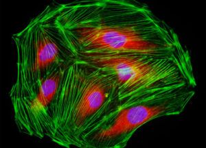 As well as looking at their DNA, sometimes I need to look at the cells under the microscope to watch how they are growing. Sometimes I need to make them fluoresce brightly with different colours so I can track certain proteins as they move around inside! Like this: