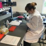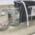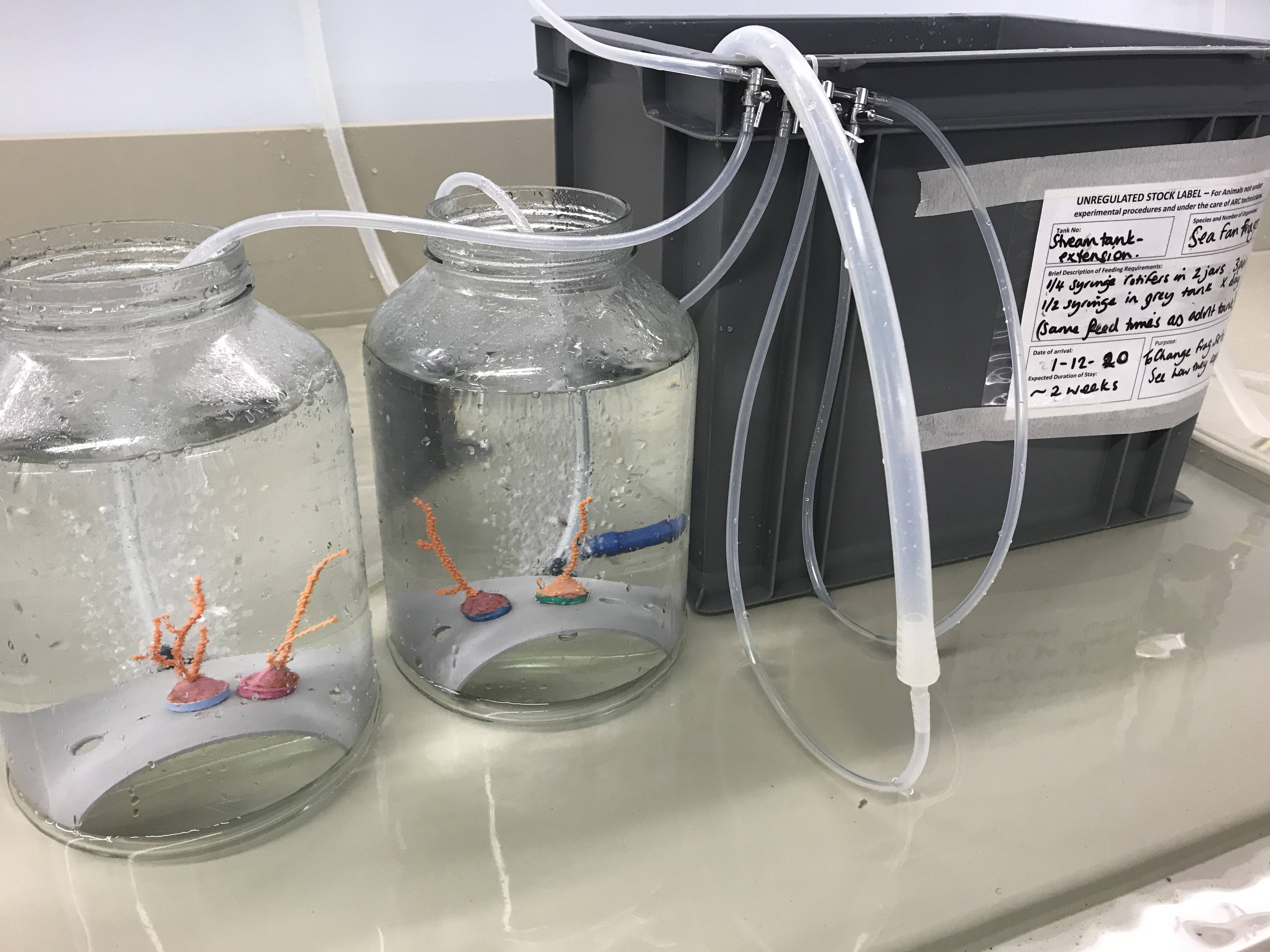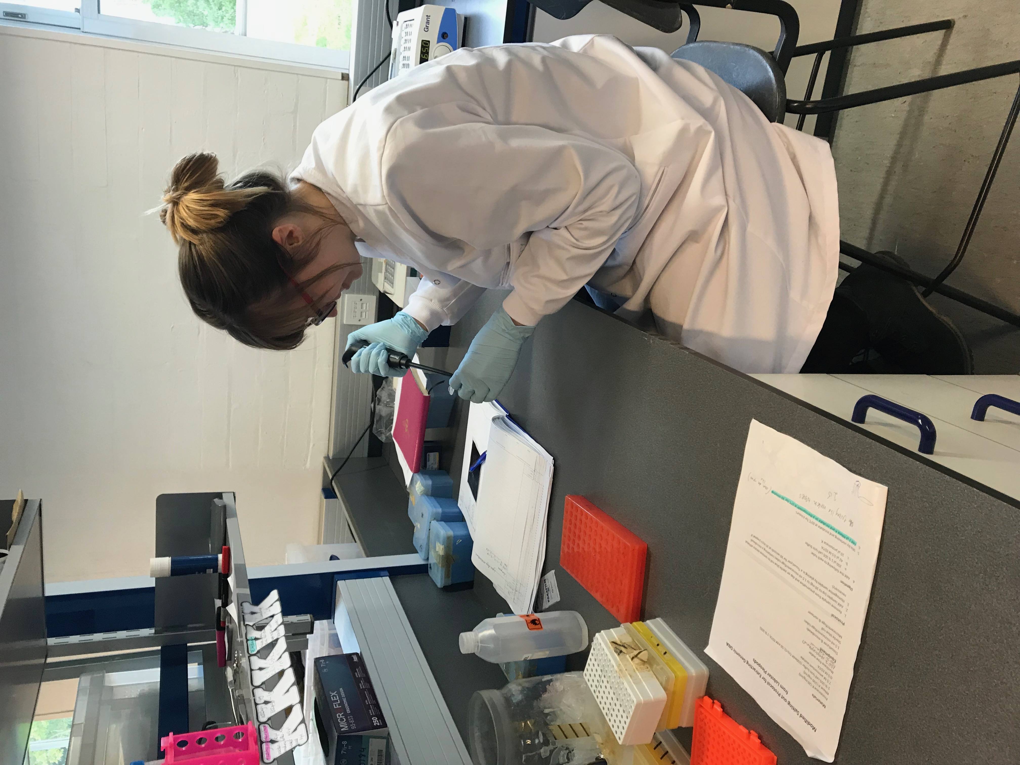 When I work in the lab I am extracting DNA from the coral. In summary, this involves mashing up a piece of coral tissue and heating it to a high temperature to digest the tissue. I then use a chemicals which separate out the DNA and make it into a solid so I can take it out and work with it.
