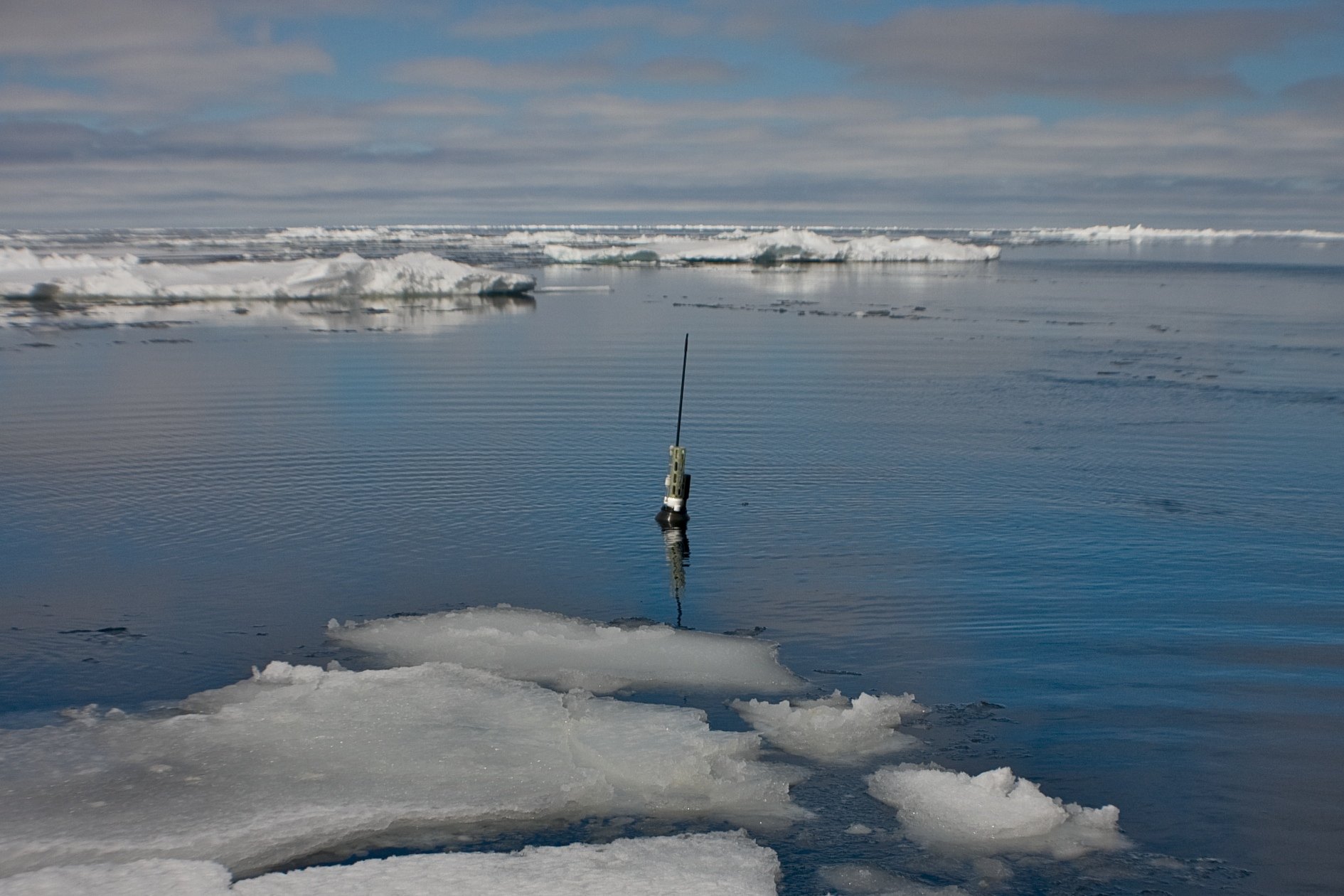 Argo float floating in the sea surrounded by sea ice. From Argo Program (https://argo.ucsd.edu)