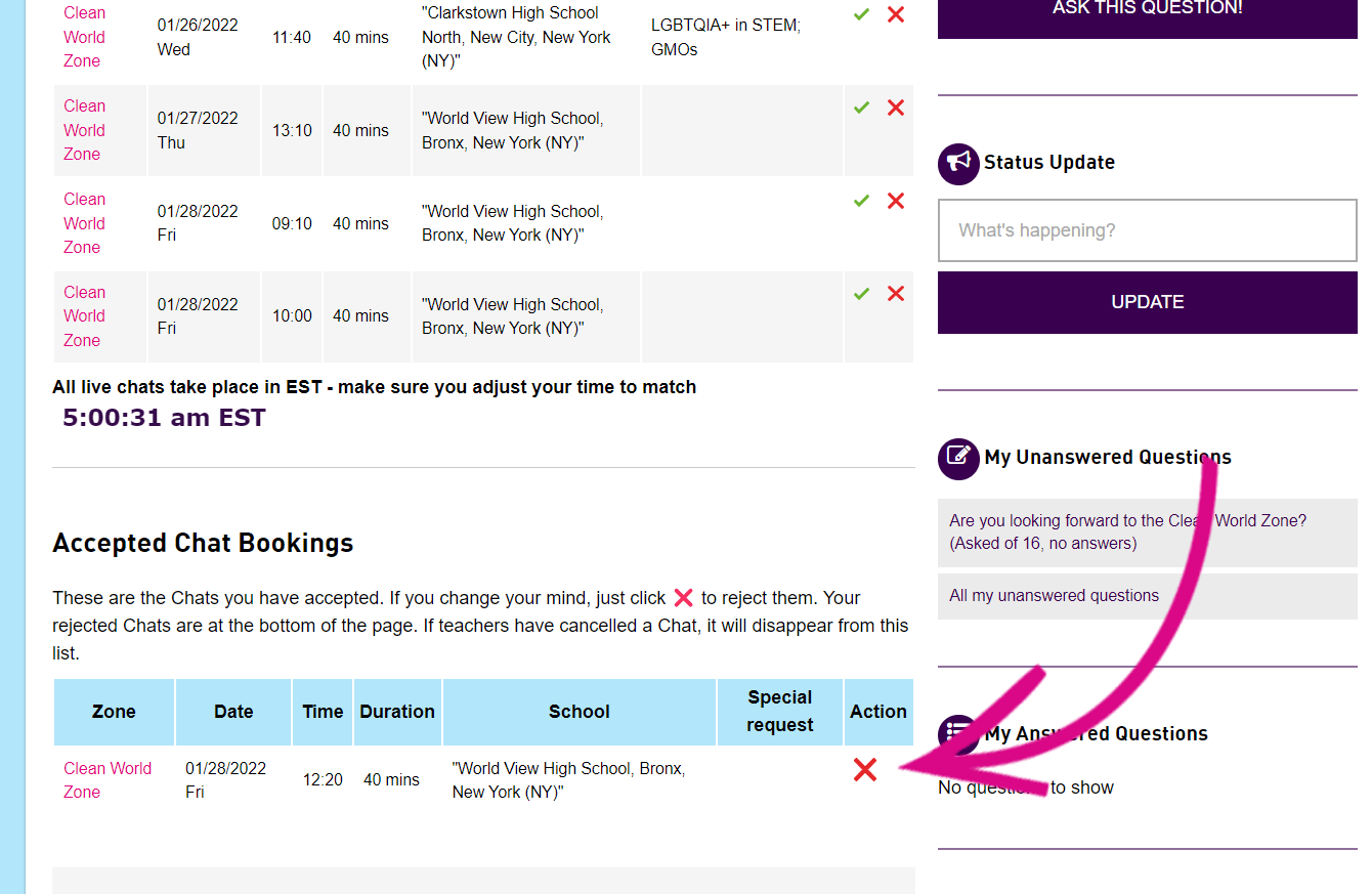 ‘X Reject’ a booking if you can’t make it, you can change your mind later if you become available, unless the chat fills up with other scientists, then it will be removed from the list.Live Chats listed under ‘New Chat Bookings‘ can still accept more scientists. If a Chat disappears from this view, it means enough scientists have now signed up to it.