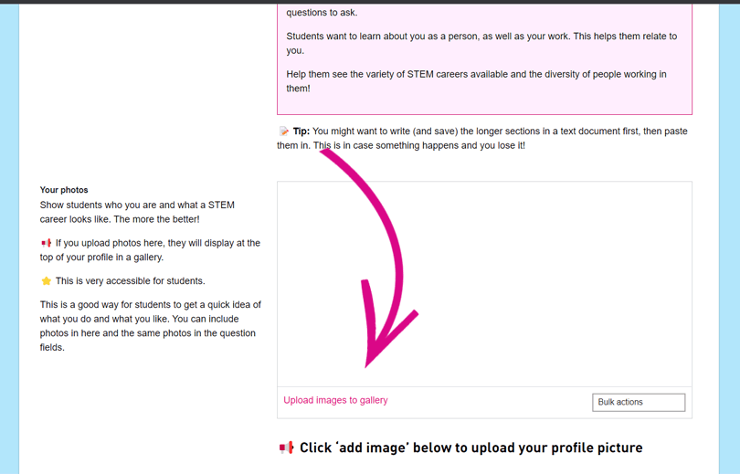 Feel free to add as many pictures as you like to your profile. Images are very accessible to students with lower literacy, and quickly shows them what a career in STEM looks like.