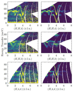 While I’m at these places, i place my crystals in front of the beam of x-rays and neutrons to scatter off them, using a big instrument like the one picture below (the MAPS spectrometer at the ISIS Neutron and Muon facility). The big blue detector panels record all the neutrons that hit them, and this allows me to construct images like the one on the left, which is the signal that you get as neutrons scatter from a crystal of Yttrium Iron Garnet (Y3Fe5O12) compared to a model I created for the magnetic interactions between iron atoms in this material.