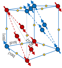 When a material is magnetic, it means that some of the atoms in the material have what is called a Permanent Magnetic Moment – this is the atomic scale version of behaving like a fridge magnet with a north and a south pole. It comes from an intrinsic property of electrons called Spin, which is very important to quantum mechanics and particle physics. If all of the atomic magnetic moments have a well-defined relationship to each other, then we say that the material is Magnetically Ordered. You can see how this looks for the simple magnet Nickel Oxide here where the arrow points in the direction of the atomic north pole: