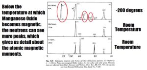 Below, you can see scattering of neutrons above and below the temperature at which manganese oxide becomes magnetic – when it is magnetic, there are extra peaks! Only neutrons can see magnetism like this, to the x-rays it is invisible. These simple experimental results were so amazing at the time that it was enough to earn Clifford Shull the 1994 Nobel Prize in physics.
