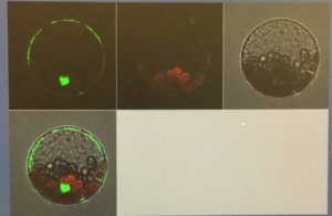 An example of my cells: The green is GFP fluorescence, the red is autofluorescence from the chlorophyll and the grey image shows that the cell is in tact.