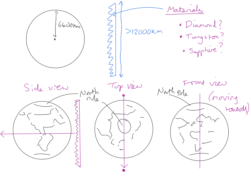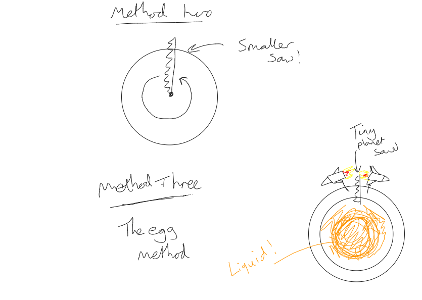 If we build the saw to half size we can simply slice down until we hit the core and then rotate around the earth… This will save us so much in the way of cost as the saw is half as big… I was debating this strategy when I decided that the best method would be method 3… the egg method.