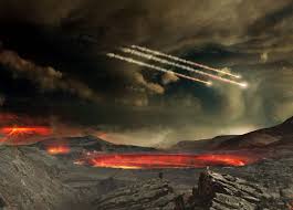 The Earth cools and volcanoes rule the lava covered world! It takes a lot of cooling and a long time! But cool it does and all that vicious atmosphere of steam has a chance to condense… It rains and the Earth is covered in water… Still a volcanic powerhouse though…