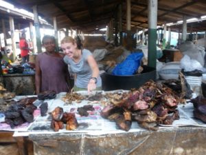 My time is split between Cambridge and Ghana. I usually spend about a month at a time in Africa, where I carry out my interviews, check out the market places where bats are sold, track down bat hunters, or help gather blood samples from the bats. Here I am with one of the wonderful vendors in a bushmeat (wild animal meat) market in Ghana: