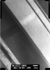 has happened (see right hand image for example of this! This is what is called a “twin”. This is when the atoms rearrange themselves if a stress is applied. This is taken at 300, 000 times magnification. So these twins are around 0.00001mm across. Feel free to ask me about it!). With this work, we hope to have a better understanding of how these ceramics break, and so then we can work out a way to make them tougher!