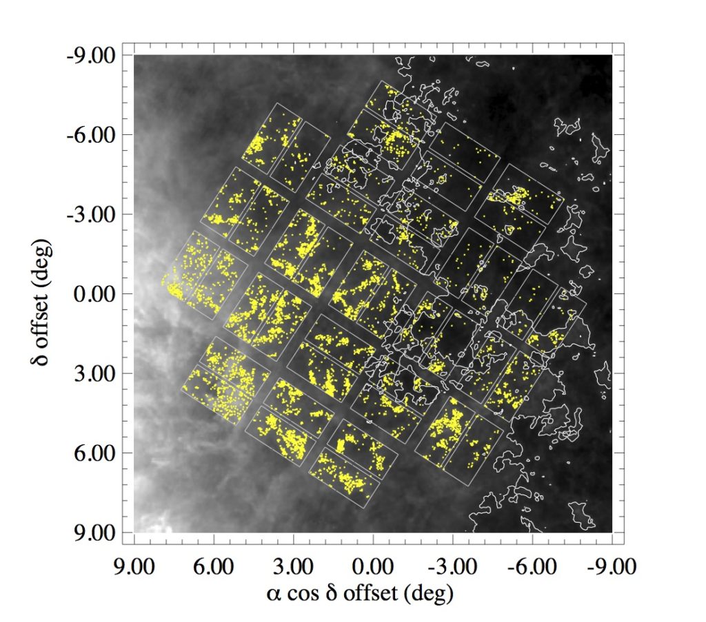 Here’s a really cool one I made, which shows stars that are being looked at by Kepler, an American space mission that is discovering loads of planets around loads of other stars. It’s just a picture of the part of the sky that Kepler is looking at, with yellow dots for interesting stars, little rectangles for the parts of the sky that Kepler is looking at, and the grey background shows some of the dust in our Galaxy.