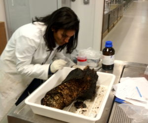 A main part of my PhD project is I want to learn as much as I can about life living at these tree falls and whale falls, especially recording the different animals found in these habitats as they usually re not found anywhere else on earth. Every time anew food fall is found, there are species new to science on it. This shows how little is known about these habitats. It is thought that because many whale-fall fauna don’t live anywhere else, whaling may have led to the extinction of hundreds of these deep-sea animals as there are now less whale bodies for them to live on. This is another reason why it is important to survey what lives at whale falls and stop whaling! I also want to look at how the animals use these food resources and estimate how important they are to the entire deep-sea ecosystem. Here is a picture of me in the lab picking animals off some wood collected from 2km depth on the SouthWest Indian Ridge off South Africa!