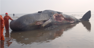 One of the strangest types of day that I can have is when a dead whale washes up on a UK beach. As this is where we get the majority of our whale bones for experiments, it means that we have to act quickly to get to the whale to cut it up before it is taken away. The last whale we cut up was a sperm whale which washed up in Kent and was filmed by the Channel 4 program ‘Inside Natures Giants”. Here is a picture of the whale.