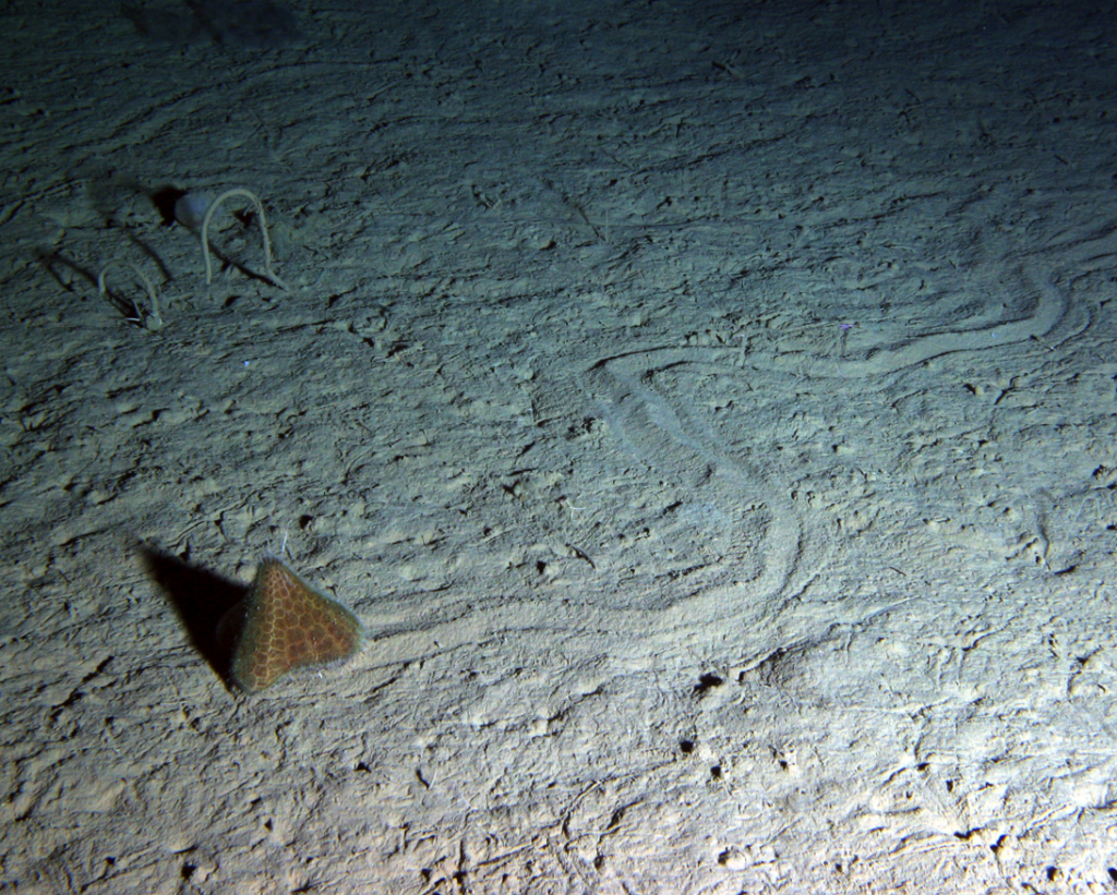 The deep sea is an extremely hostile environment that covers 2/3 of the planet – there are extremely low temperatures, very high pressures, no light and very little food. This lack of food means there aren’t huge numbers of animals living in the deep sea, like those seen at coral reefs. Here is typical picture of the seafloor.