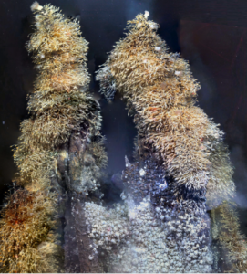 When the bones are mostly clean of flesh, the second stage begins: the enrichment-opportunist stage. A completely different set of fauna that are usually much smaller in size come to live off any pieces of flesh or poo left around the carcass – e.g, amphipods, snails, worms, isopods, small fish. Here is a photo of this stage from a whale fall found off California.