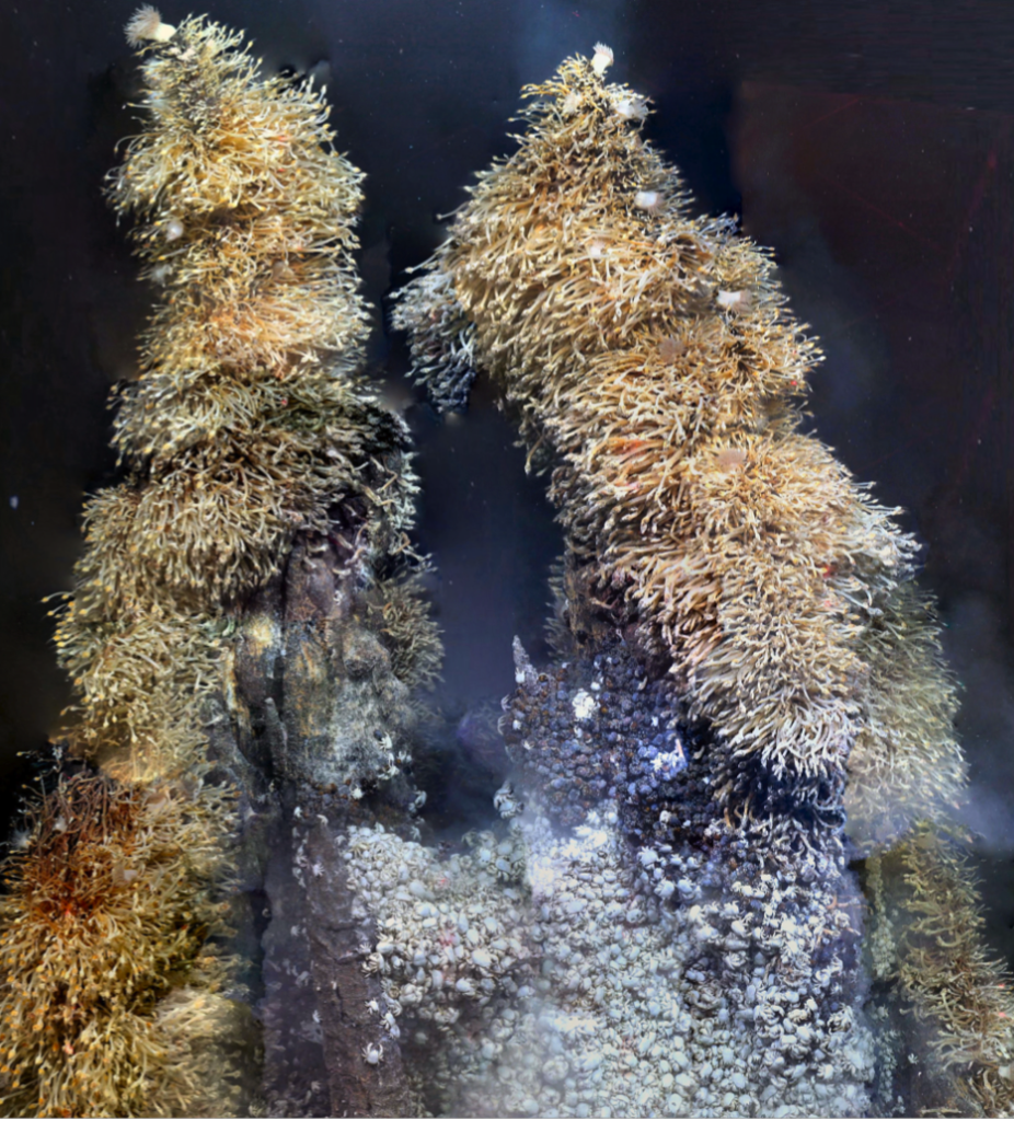 These rare chemosynthetic ecosystems can live totally independent of sunlight. Up until about 40 years ago, scientists thought this was impossible! Other types of these ecosystems in the deep sea include cold seeps and hydrothermal vents. Here is a picture of some hydrothermal vents found in the Antarctic deep-sea at 1.5km depth.