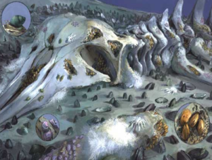 The last stage is known as the sulphophilic stage. This stage can last up to 100 years (a long time!) and is extremely unique. Whale bones have huge amounts of fats and oils in them. Anaerobic bacteria use this fat releasing sulphides as a by-product. These sulphides form the basis of the food chain during this 3rd stage as different bacteria use these sulphides for energy. This is like plants getting energy from sunlight and forming the base of the food chain on land (photosynthesis); these bacteria use the sulphides for energy and form the basis of the food chain in this deep-water environment (chemosynthesis). The animals at the 3rd stage of the whale fall either have these chemosynthetic bacteria living within them (endosymbionts) or they feed directly on the bacteria growing on the bones. During this stage, the fauna is very specific – mussels, clams, isopods, amphipods etc. Here is a drawing of the 3rd stage stage.